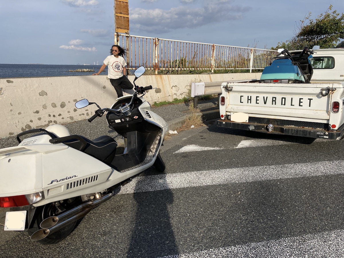 ハーレー屋・S君のChevroletに積んで、最後の横須賀の風景を見せに、馬堀海岸遊歩道まで来た。