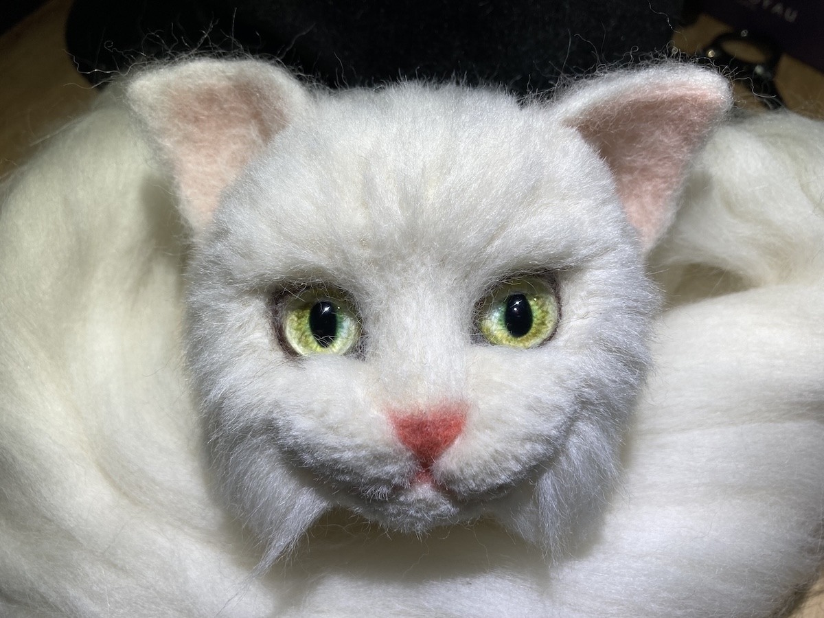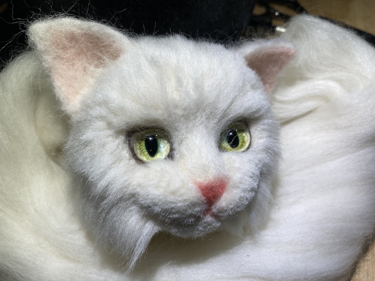 まぶたの上までは、点描刺しと言って、羊毛を爪楊枝くらいの束にしたものを根気よく刺すことの繰り返し。すっごい時間かかる😮💨😮💨😮💨