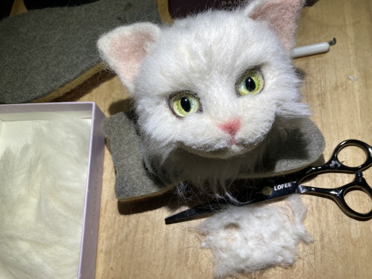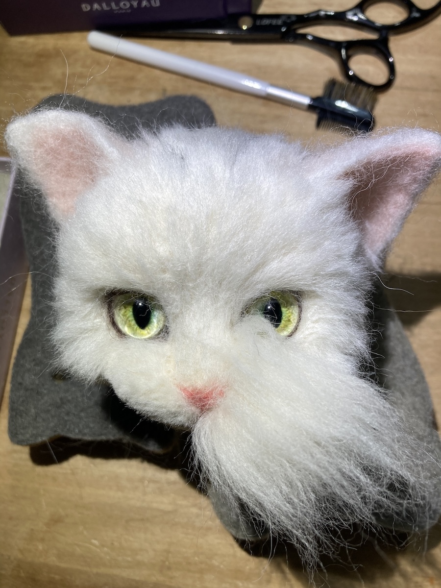 口周りのマズルと呼ばれる部分は、さらに細かい点描刺しをして、短くカットする。